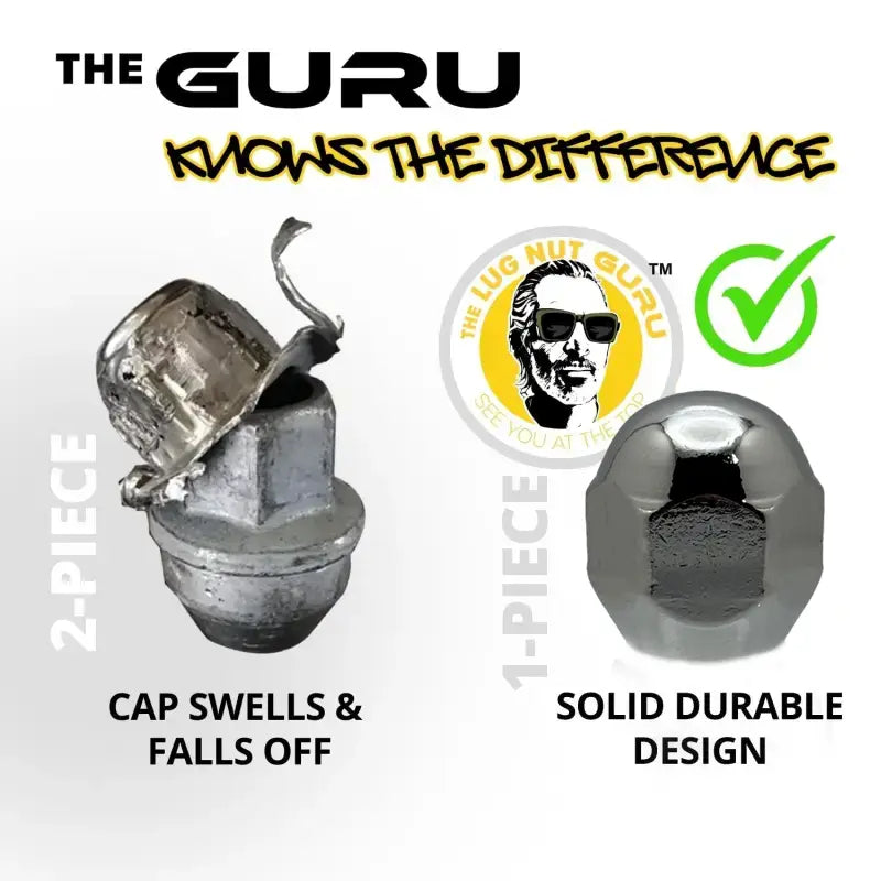 The original lug nuts on certain vehicles feature a two-piece design that is prone to failure, often leading to warping and making removal challenging. The thin cap on these nuts can get damaged over time, and if moisture seeps underneath, it can cause the cover to bulge. These issues can make the lug nuts difficult or even impossible to remove, sometimes requiring wheel damage to get them off. The Lug Nut Guru OE replacement offers a solution with its one-piece, carbon steel design, which matches the original fit and function while preventing these common problems.