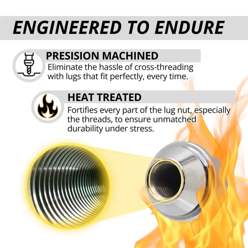 - Corrosion Resistance: By removing the vulnerable cap that is present in OEM lug nuts, this design prevents moisture and rust from causing bulging and deformation.