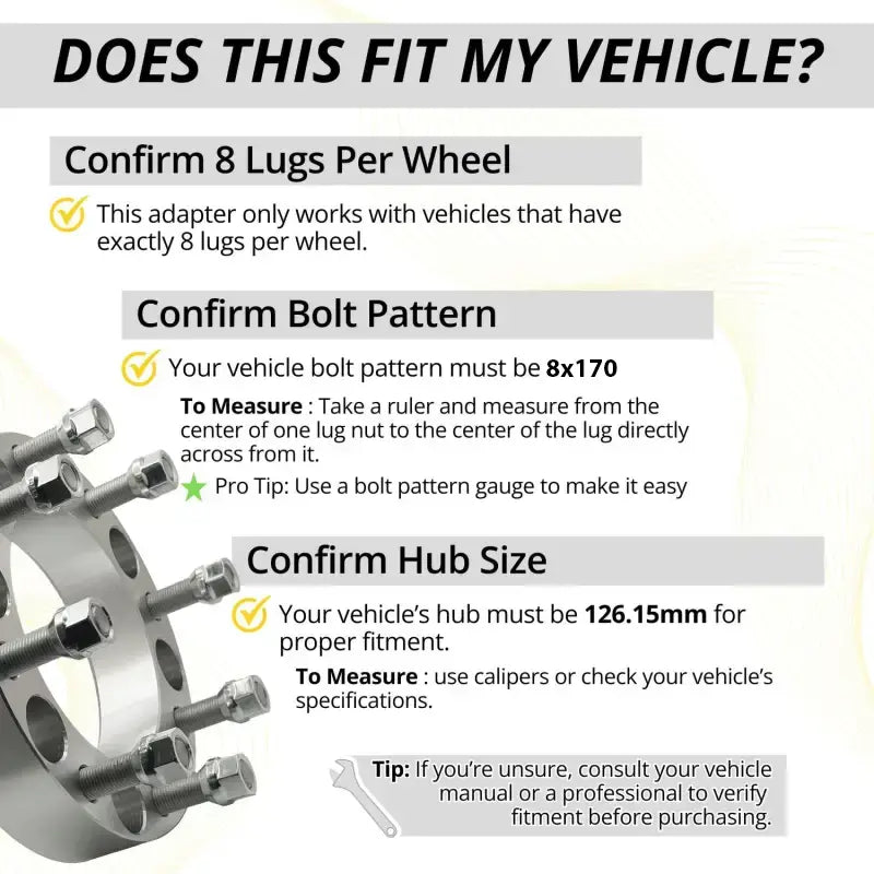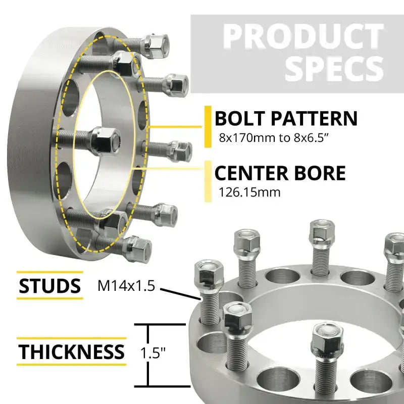 Our high-quality 1.5 inch wheel adapters make it easy to fit wheels with a 8x170mm bolt pattern onto wheels with a 8x6.5" bolt pattern. Crafted from lightweight and durable T6 6061 billet aluminum, these adapters ensure strength and precision. The set comes with all the necessary hardware for a simple installation. Perfect for giving your vehicle a custom look or fixing fitment issues, these adapters are built to last. Whether you’re upgrading your wheels or need a different bolt pattern, our adapters make it possible.